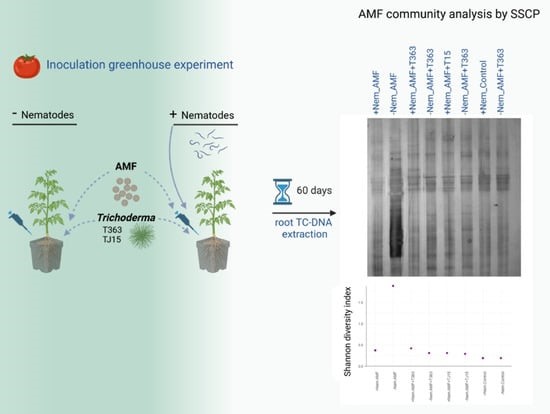 Arbuscular mycorrhizal fungi (AMF) and Trichoderma spp. (T) are known as plant-beneficial fungi effective against root-knot nematodes, but their interactions in the rhizosphere are not well understood. This study examined how Meloidogyne javanica influences AMF colonization and community diversity at the root-soil interface of tomato plants. A 60-day growth chamber experiment was conducted with tomato plants grown in non-sterile agricultural soil, either infected or not with M. javanica, that received a single inoculation with AMF or Trichoderma (strains T363 or TJ15), combined AMF + T inoculations, or no inoculation (Control). Both single and combined inoculations significantly reduced root galls, eggs, and soil nematode larvae. An AMF community analysis via single-strand conformation polymorphism of the D1 region of 28S rDNA gene (Glomeraceae family) revealed that M. javanica decreased AMF diversity and altered community structure, in plants single-inoculated with AMF. However, a combined inoculation with Trichoderma appears to prevent this reduction and maintain AMF diversity. While M. javanica reduced root mycorrhizal colonization, it did not affect Trichoderma abundance. These results suggest that Trichoderma may be more resilient to nematode infection, helping stabilize AMF communities and enhance biocontrol. Thus, combining AMF and Trichoderma inoculations could better preserve root health and improve biological control effectiveness against M. javanica.